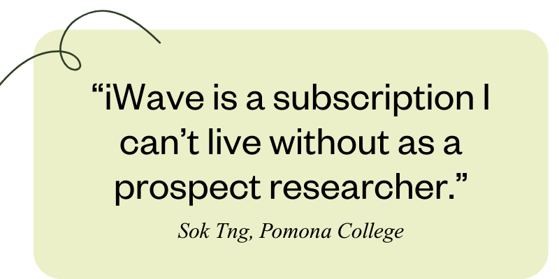 While Pomona College leverages multiple tools across its advancement technology stack, iWave remains Sok’s “jumping-off point”—the system she trusts to frame the research process before deeper analysis begins.
